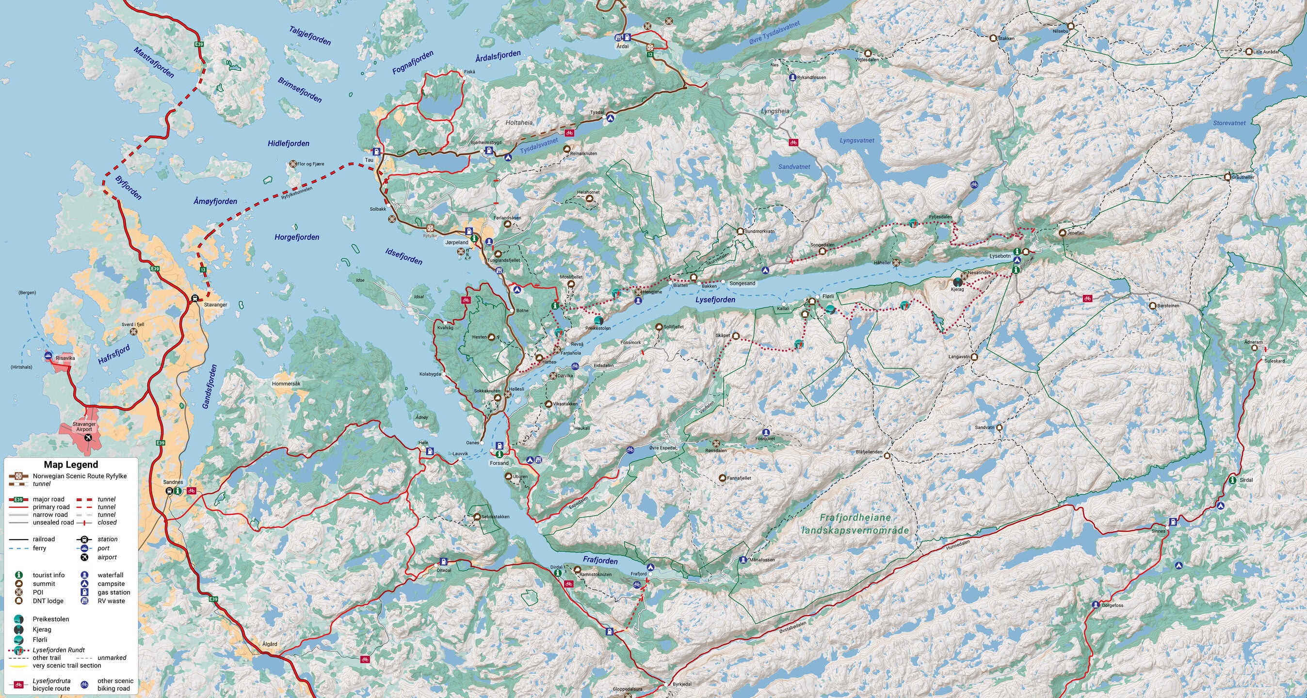 La Lysefjordruta est une nouvelle piste cyclable (2022) reliant tous les points d'accès, villes et sites touristiques autour du Lysefjord. En la parcourant à vélo, vous découvrirez la nature sous un angle inédit. Le paysage défile lentement, tout en vous permettant de couvrir de vastes distances en une journée. À vélo, il est facile de s'arrêter aux points de vue et sites d'intérêt le long du parcours.