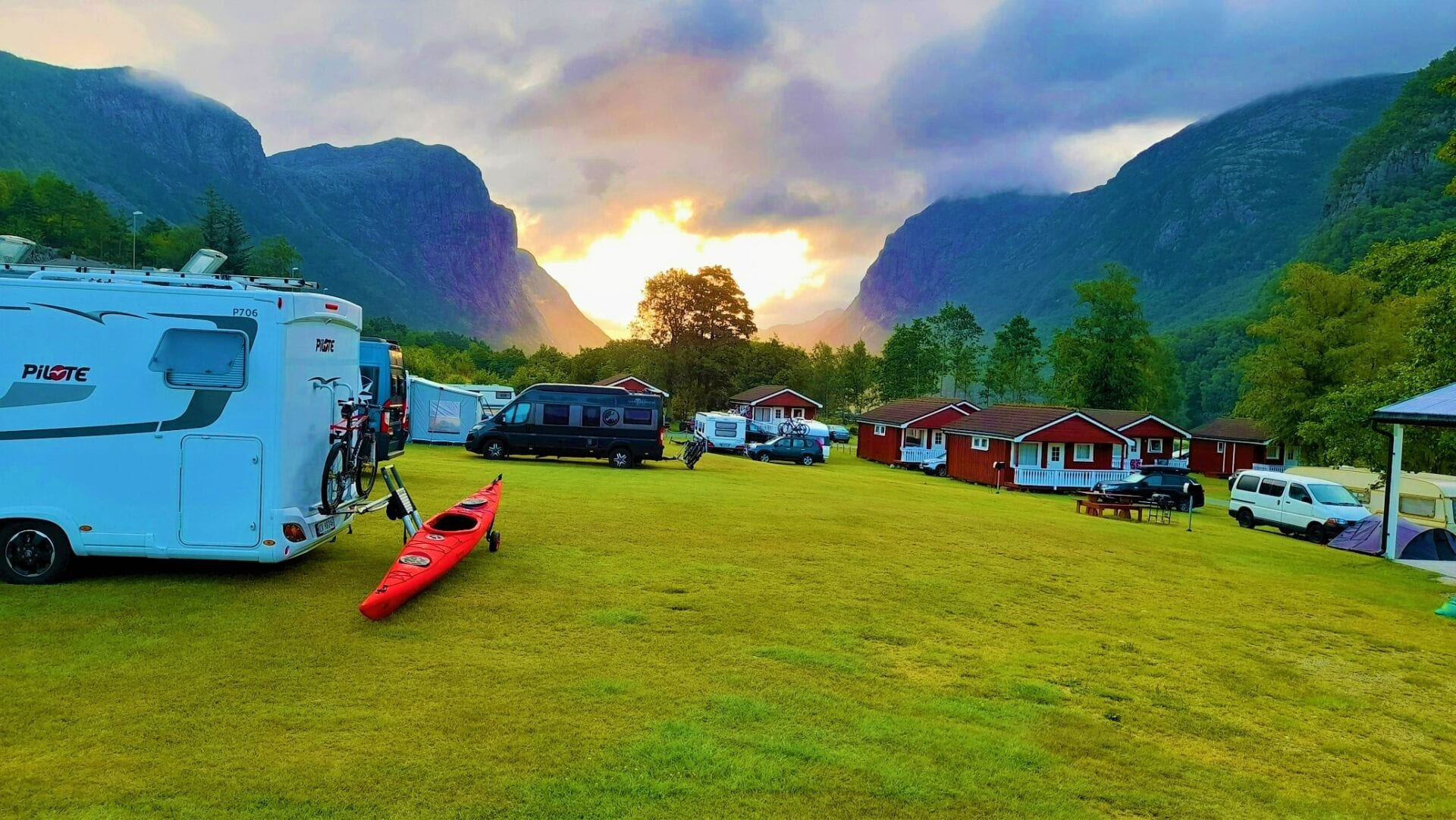 Rolig camping ved Tysdalsvatnet, omkranset av fjell.