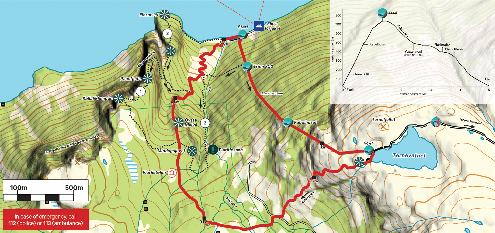 这条阶梯步道起点位于弗洛尔利(Flørli),就在发电厂和渡轮码头旁边。前两公里路程沿着著名的4444级台阶组成的世界最长木制阶梯而行。到达山顶后,我们建议您沿着穿过森林的小径下山,继续前往弗洛尔利村的遗址。不建议直接沿着阶梯下山。.
