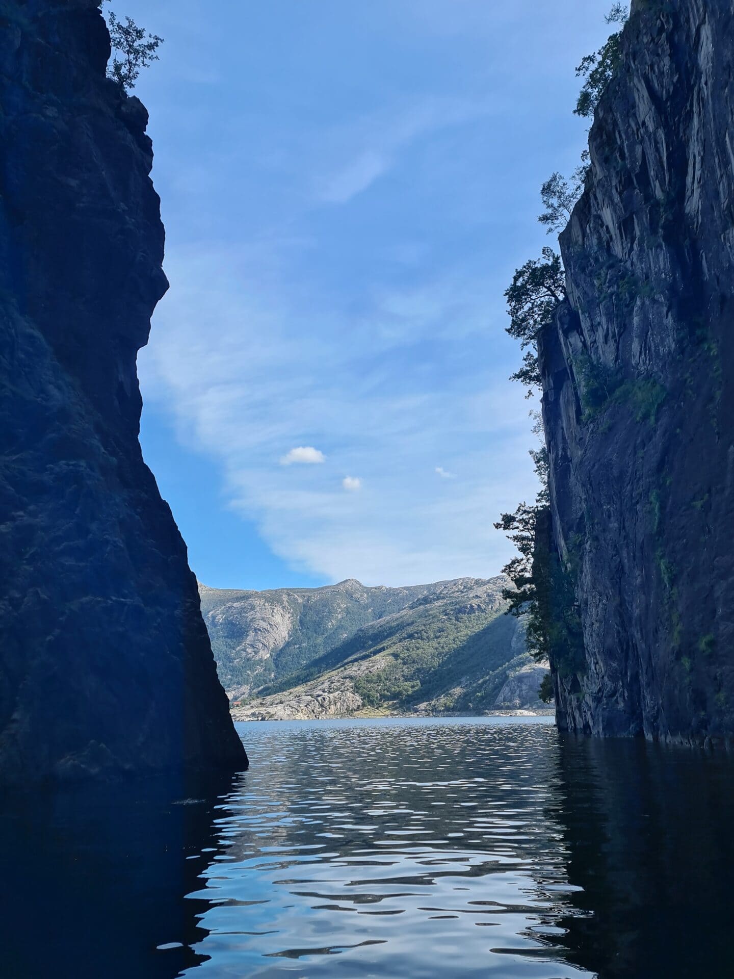 虽然从海上可能不太容易找到这个海湾,但它现在已成为游览吕瑟峡湾的游客必去的景点。如果您沿着吕瑟峡湾航行,并始终保持在峡湾的左侧,您会看到山体上的一条裂缝,那就是海湾的入口。海湾静静地坐落在一个被陡峭群山环绕的小海湾中,游客可以尽情欣赏壮丽的景色,仿佛穿越到了另一个时代。虽然入口狭窄,但足以让小型船只通过。当游船驶入海湾时,船上会播放激昂的民族歌曲,营造出更加浓厚的氛围。.